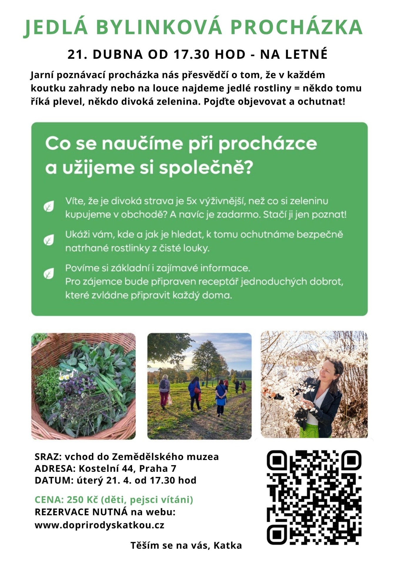 21. dubna 2026 (17.30 - 19.00) - JEDLÁ BYLINKOVÁ PROCHÁZKA NA LETNÉ - znovu budeme okukovat a ochutnávat (bezpečně nasbírané jinde) jarní plevele = divokou zeleninu v Letenských sadech. Přijďte s dětmi, pejsci nebo i kočárky vítány. Sraz u Zemědělského muzea, rezervace nutná předem na eshopu.