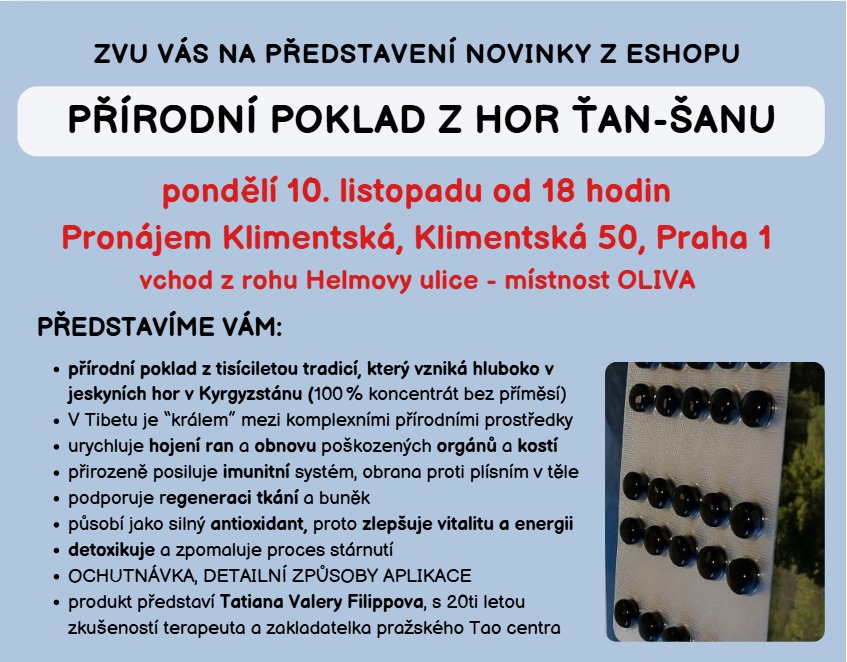 10. listopadu v 18 hodin, Klimentská 50, Praha 1 (pár minut pěšky od Florence) PŘEDSTAVÍME VÁM MUMIO GOLD: přírodní poklad z tisíciletou tradicí, který vzniká hluboko v jeskyních hor v Kyrgyzstánu (100 % koncentrát bez příměsí) V Tibetu je "králem" mezi komplexními přírodními prostředky urychluje hojení ran a obnovu poškozených orgánů a kostí přirozeně posiluje imunitní systém, obrana proti plísním v těle podporuje regeneraci tkání a buněk působí jako silný antioxidant , proto zlepšuje vitalitu a energii detoxikuje a zpomaluje proces stárnutí OCHUTNÁVKA, DETAILNÍ ZPŮSOBY APLIKACE A ZKUŠENOSTI I DOTAZY na místě. Bájné mumio nám představí Tatiana Valery Filippova , lektorka s 20ti letou zkušeností a zakladatelka pražského Tao centra = moc milá žena, která se narodila v Kyrgyzstánu, proto se rozhodla ho do Čech kdysi přivést a představit jeho vzácnou sílu. Bylinný čaj a ochutnávka v ceně Neváhejte, počet míst je omezen