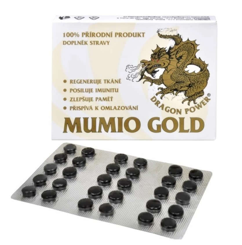 MUMIO GOLD DRAGON POWER, 30 tablet po 200 mg, podrobný návod k použití a dávkování je součástí balení. Výrobce Polikontrol s.r.o. Biškek, Kyrgyzstán